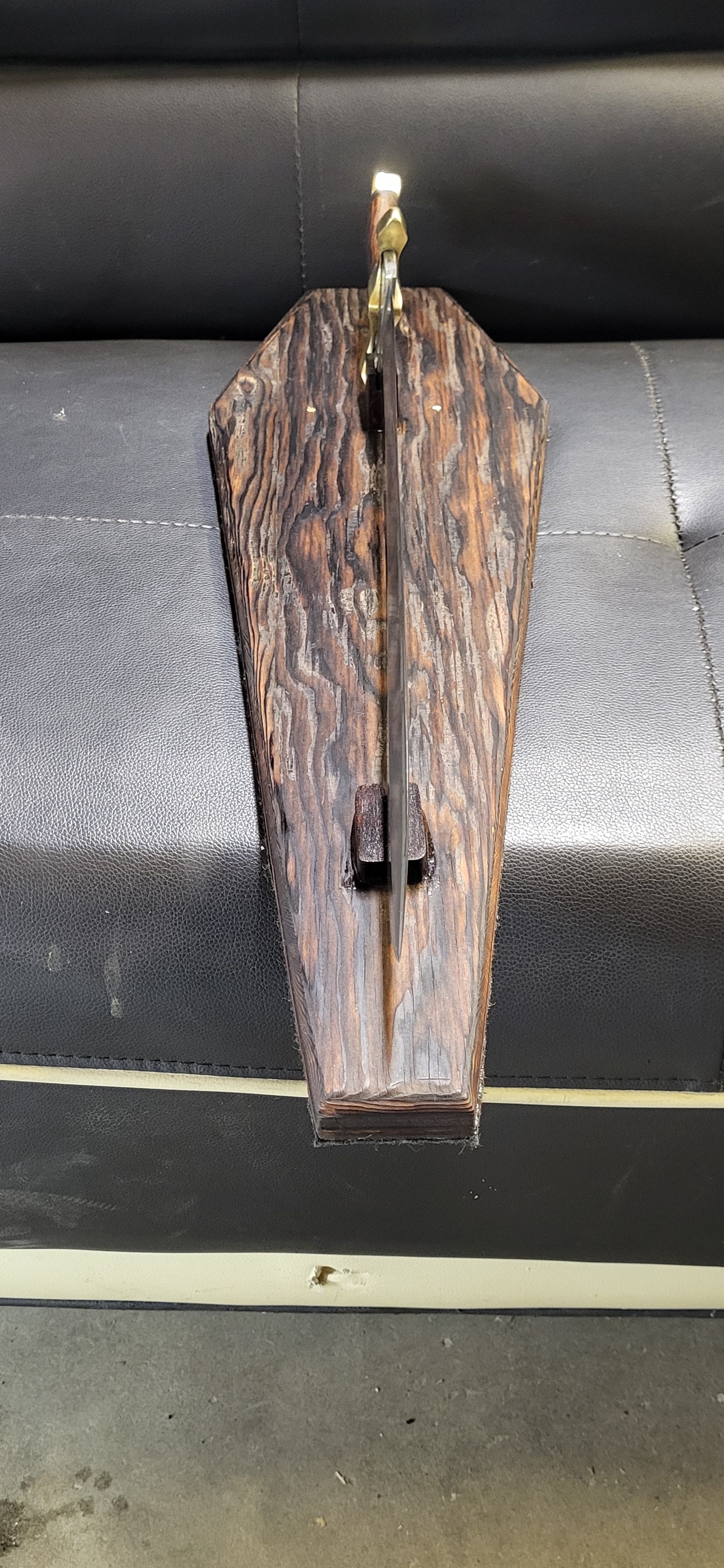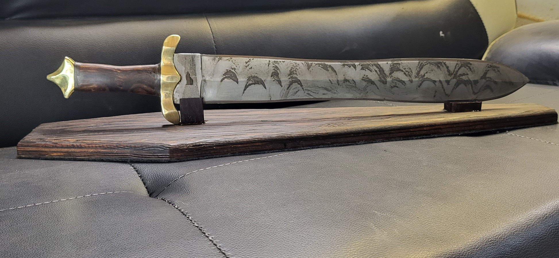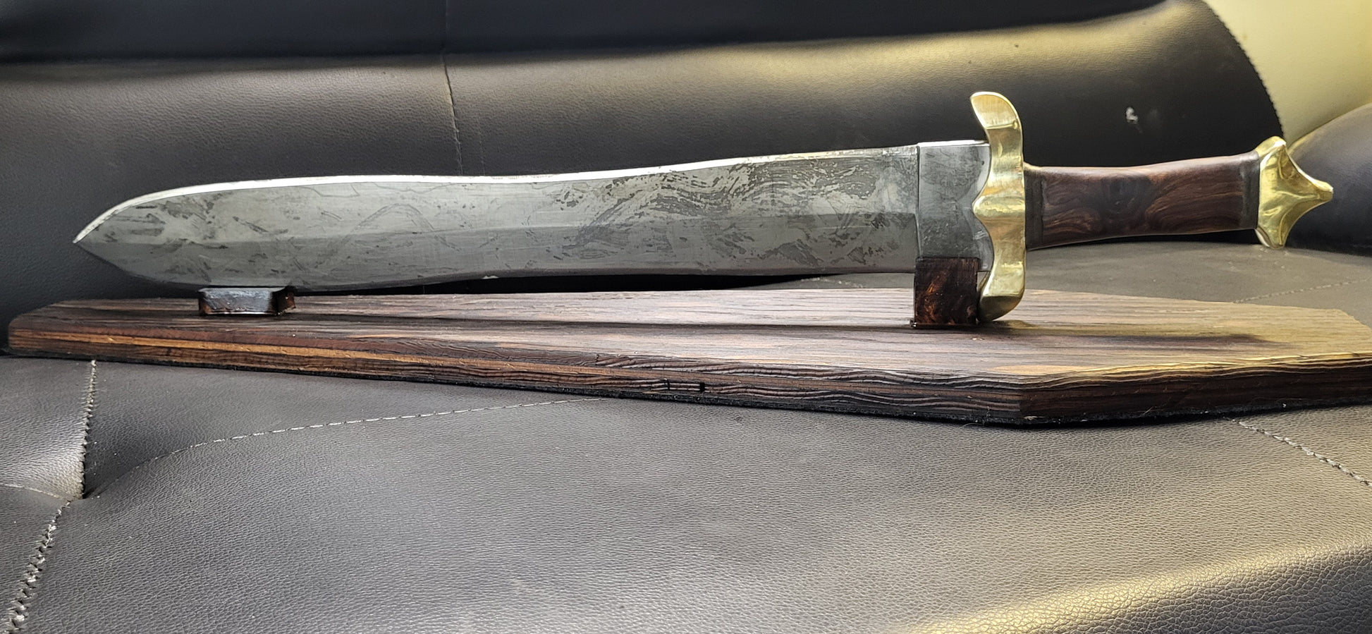 This short sword made from recycling leaf spring sports a mustard etch and hand poured brass threaded pommel and ironwood sitting on a coffin style base